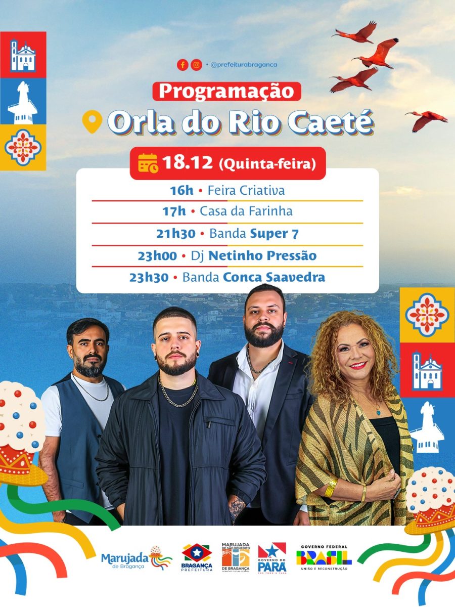 A programação será realizada no dia 18 de dezembro (quinta-feira), na Orla do Rio Caeté, com atividades ao longo da tarde e da noite, promovendo cultura, lazer e valorização das tradições bragantinas.