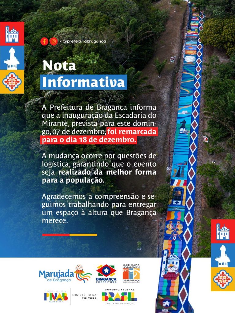 A Prefeitura de Bragança informa que a inauguração da Escadaria do Mirante, prevista para este domingo, 07 de dezembro, foi remarcada para o dia 18 de dezembro.
