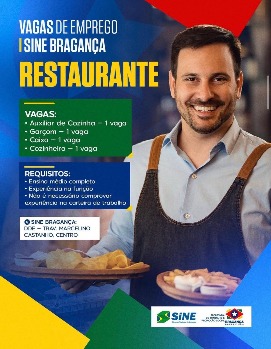 O SINE Bragança está com novas vagas abertas para o setor de restaurante, oferecendo uma oportunidade para quem deseja ingressar ou se recolocar no mercado de trabalho em Bragança.