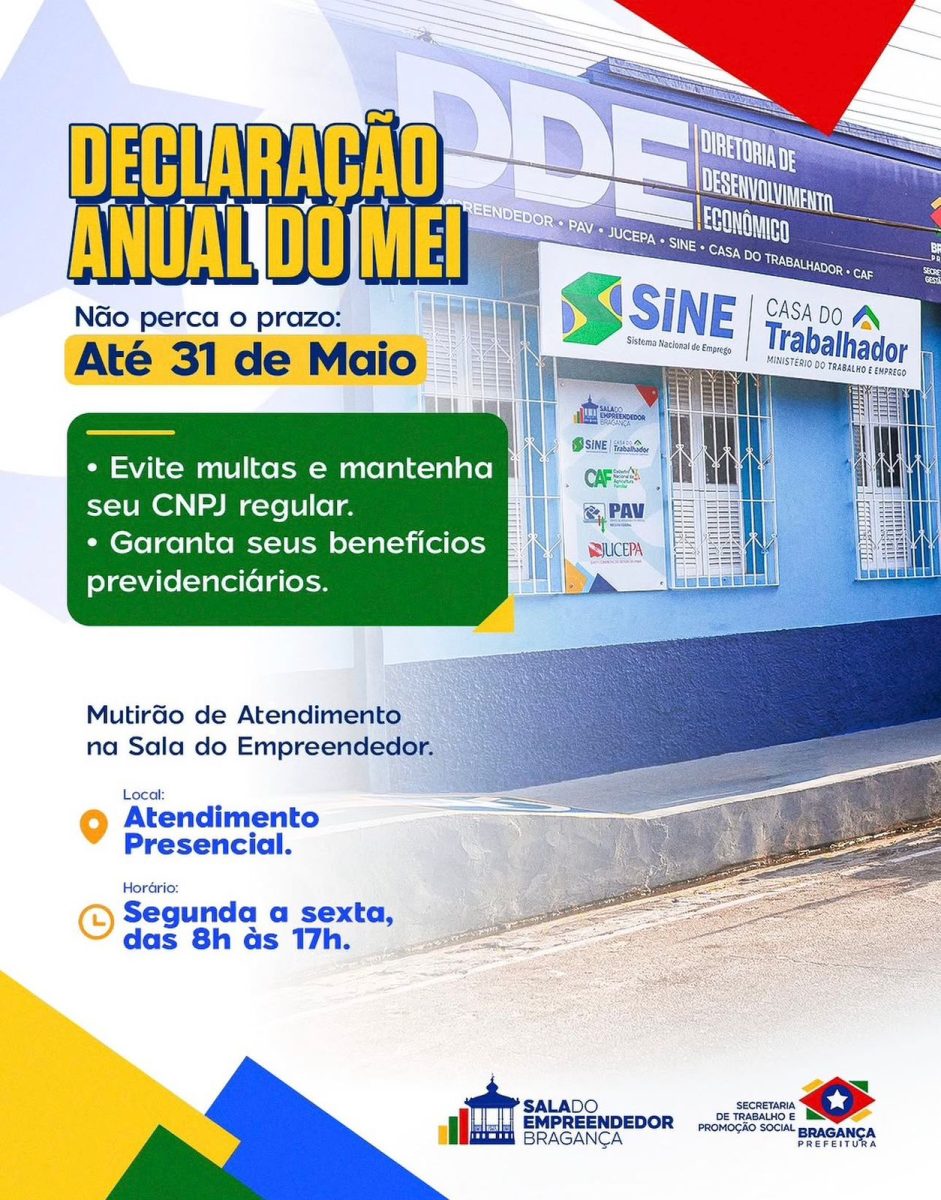 A Prefeitura de Bragança alerta os microempreendedores individuais sobre o prazo para a Declaração Anual do MEI, que segue até 31 de maio.