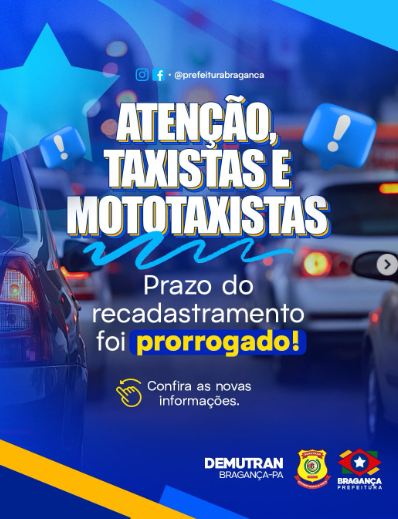 A Prefeitura de Bragança informa que o prazo para o recadastramento obrigatório de taxistas e mototaxistas foi prorrogado, garantindo mais tempo para a regularização dos profissionais.