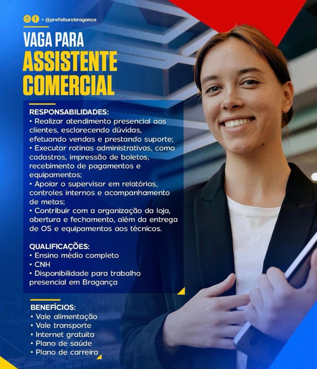 O SINE Bragança está com vaga aberta para Assistente Comercial em Bragança.